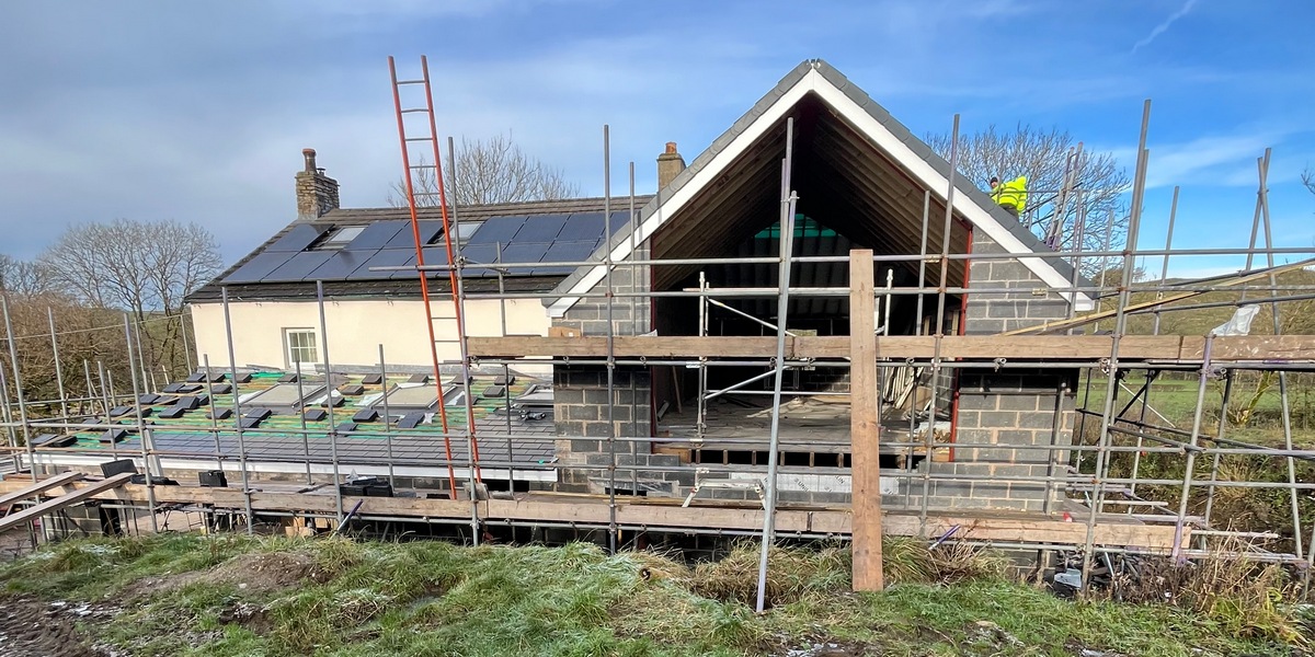 This is a very large extension to an old traditional farm house. Work is currently ongoing on this project. Block cavity wall with render and stone finishes to suit the house. 3 bedrooms added and 2 bathrooms along with a kitchen living area looking out to the fells via a triangular portal created using steel.