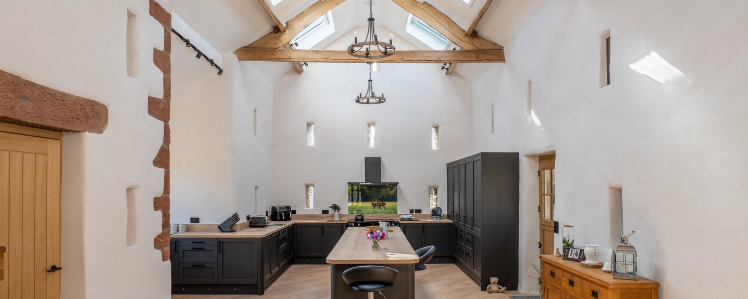 A charming barn in Lanercost, converted into the kitchen of a new house. We used our special plaster pump to spray the internal walls with Diathonite Thermactive cork-lime insulating plaster. Argatherm lime-based finishing plaster was then applied, and the surface finished with breathable paint to give a stunning look.